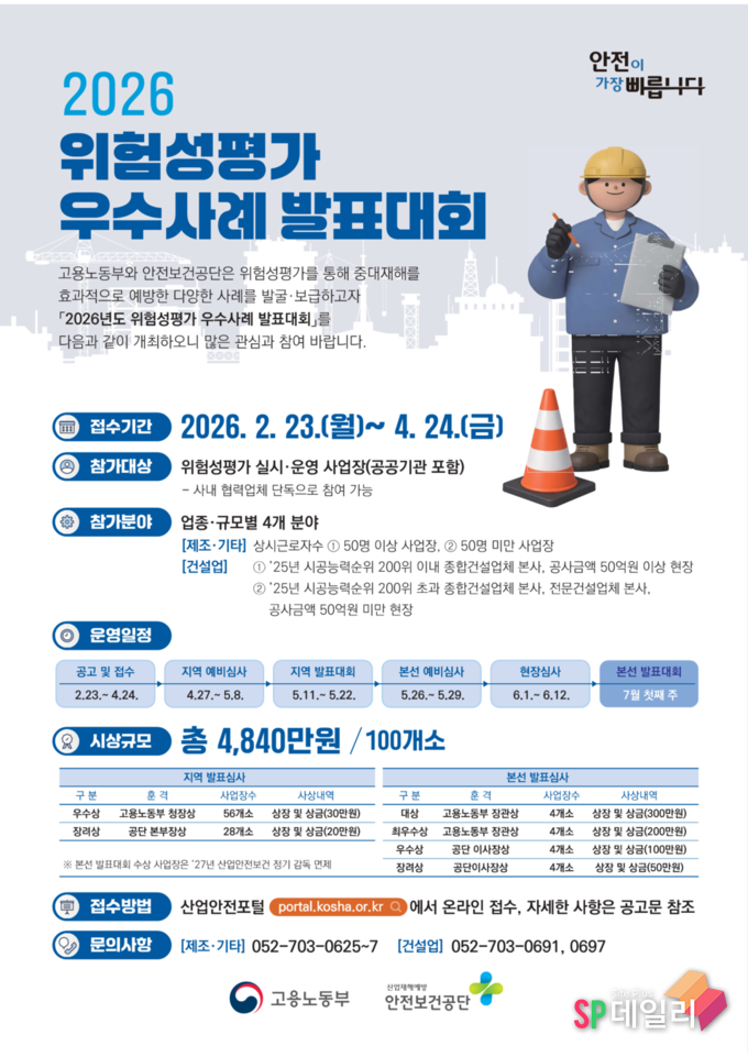 [ SP데일리 김지훈 기자 ] 고용노동부(장관 김영훈)와 한국산업안전보건공단(KOSHA, 이사장 김현중)은 2월 23일(월)부터 4월 24일(금)까지 ‘2026년 위험성평가 우수사례 발표대회’ 참가기업을 모집한다.